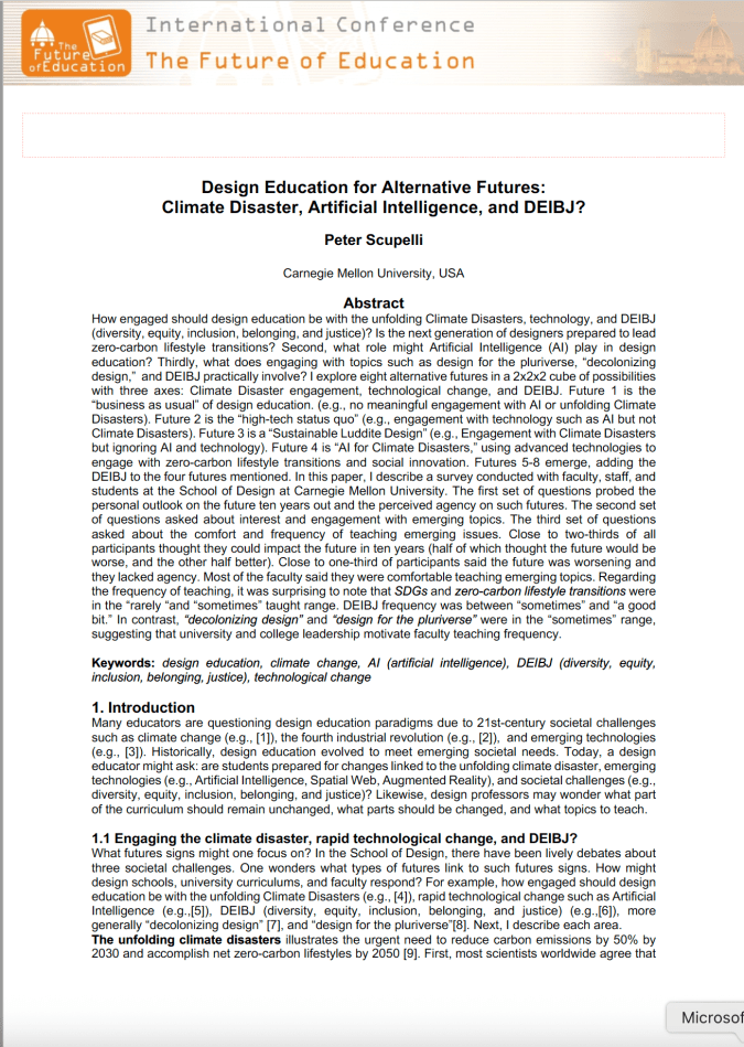 Peter Scupelli is presenting a paper titled “Design Education Alternative Futures: Climate Disaster, Artificial Intelligence, and DEIBJ?” at the 14th Future of Education International Conference in Florence, Italy on June 19-21.